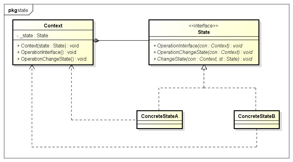 State以封装与Context的一个特定状态相关的行为,如接口OperationInterface(),OperationChangeState() - 编写 State 中一个改变 Context 状态的方法